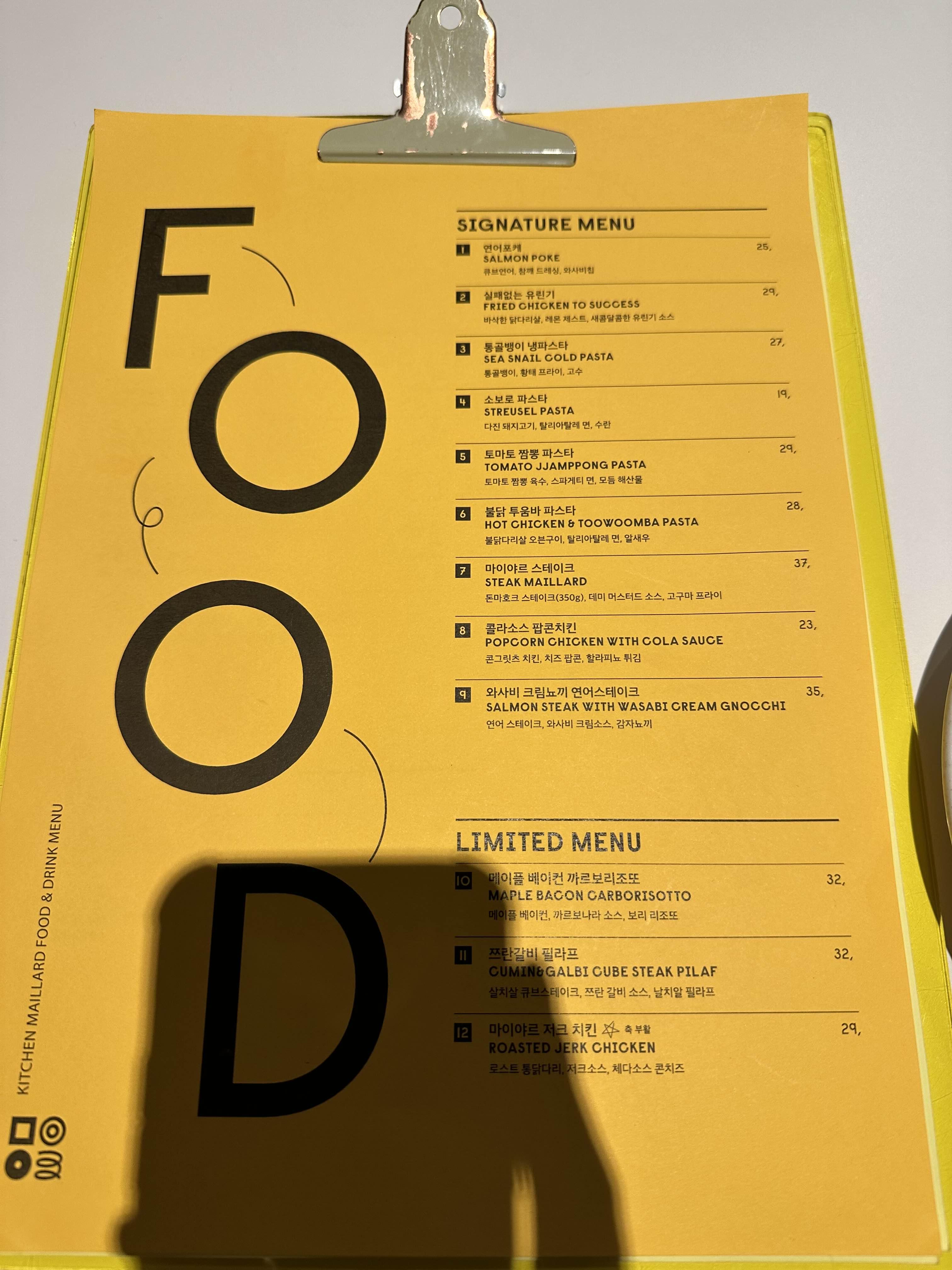 저희는 두 개 중에 고민하던 중에 다행히 저크치킨은 그날 주문이 안된다고 해서 고민 없이 마이야르 스테이크를 시켰습니다. 다음에 가면 저크 치킨을 먹어보고 싶네요^^